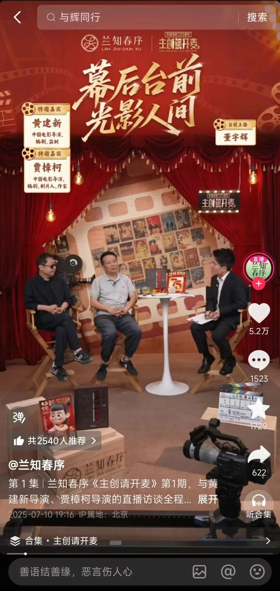 7月3日,他開通新賬號“蘭知春序”,聚焦文化和旅游領域,一周吸粉150萬;9日,該賬號推出全新欄目《主創(chuàng)請開麥》,由董宇輝對話黃建新、賈樟柯導演,聚焦中國電影的幕后臺前。