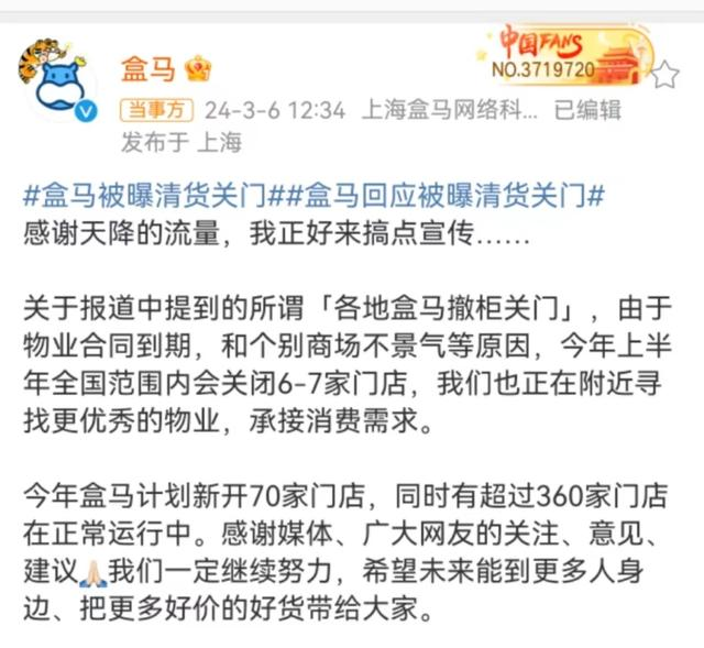 從門店運營情況來看,盒馬近年來經歷了多次門店調整,多地傳出撤柜、關門消息。僅在2024年上半年,就有因物業(yè)合同到期、個別商場不景氣等原因,全國范圍內計劃關閉6-7家門店。盡管盒馬方面表示正在附近尋找更優(yōu)秀的物業(yè)承接消費需求,且今年計劃新開70家門店,但關店事件仍引發(fā)了外界對其經營狀況的擔憂。