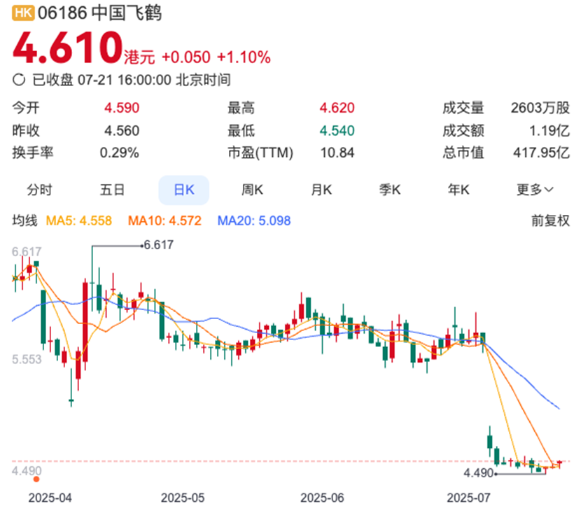 遺憾的是,大手筆回購以及分紅策略,并未提振資本市場的信心。截至7月21日,飛鶴股價報收4.61港元/股,相較披露2025年中期業(yè)績預(yù)告前的5.7港元/股,暴跌19.12%。