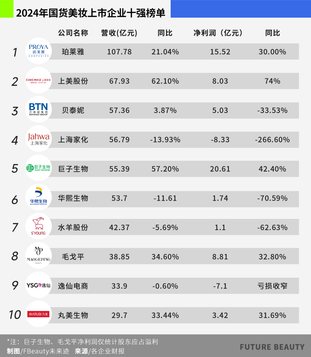 但是十強(qiáng)的變動(dòng)多數(shù)為位次的變化,“新面孔”出現(xiàn)的頻次并不多,而2024年年底成功上市的毛戈平,也成為該年十強(qiáng)榜單中的唯一“新面孔”?梢,企業(yè)上市的成功與否,直接影響了行業(yè)頭部競爭格局。
