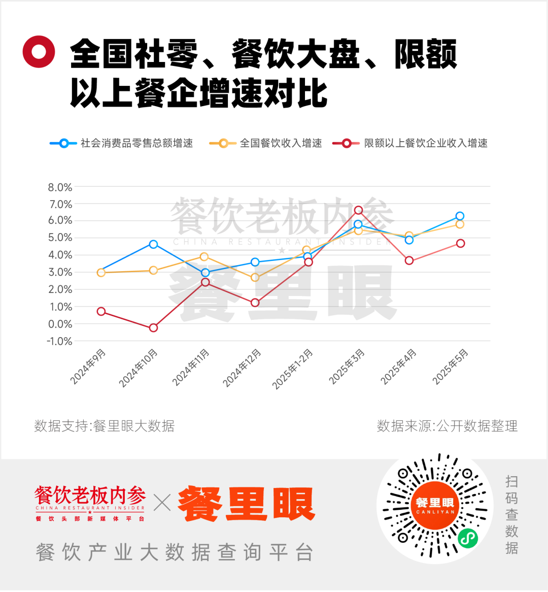 結(jié)合全國社會消費品零售總額增速、全國餐飲收入增速、限額以上餐飲企業(yè)收入增速的三方數(shù)據(jù)對比來看:全國餐飲收入半年來均呈現(xiàn)持平或低于社會消費品總額增速的情況;限額以上餐企則除今年3月外,連續(xù)8個月低于社會消費品總額增速,甚至在2024年末出現(xiàn)了負(fù)增速。