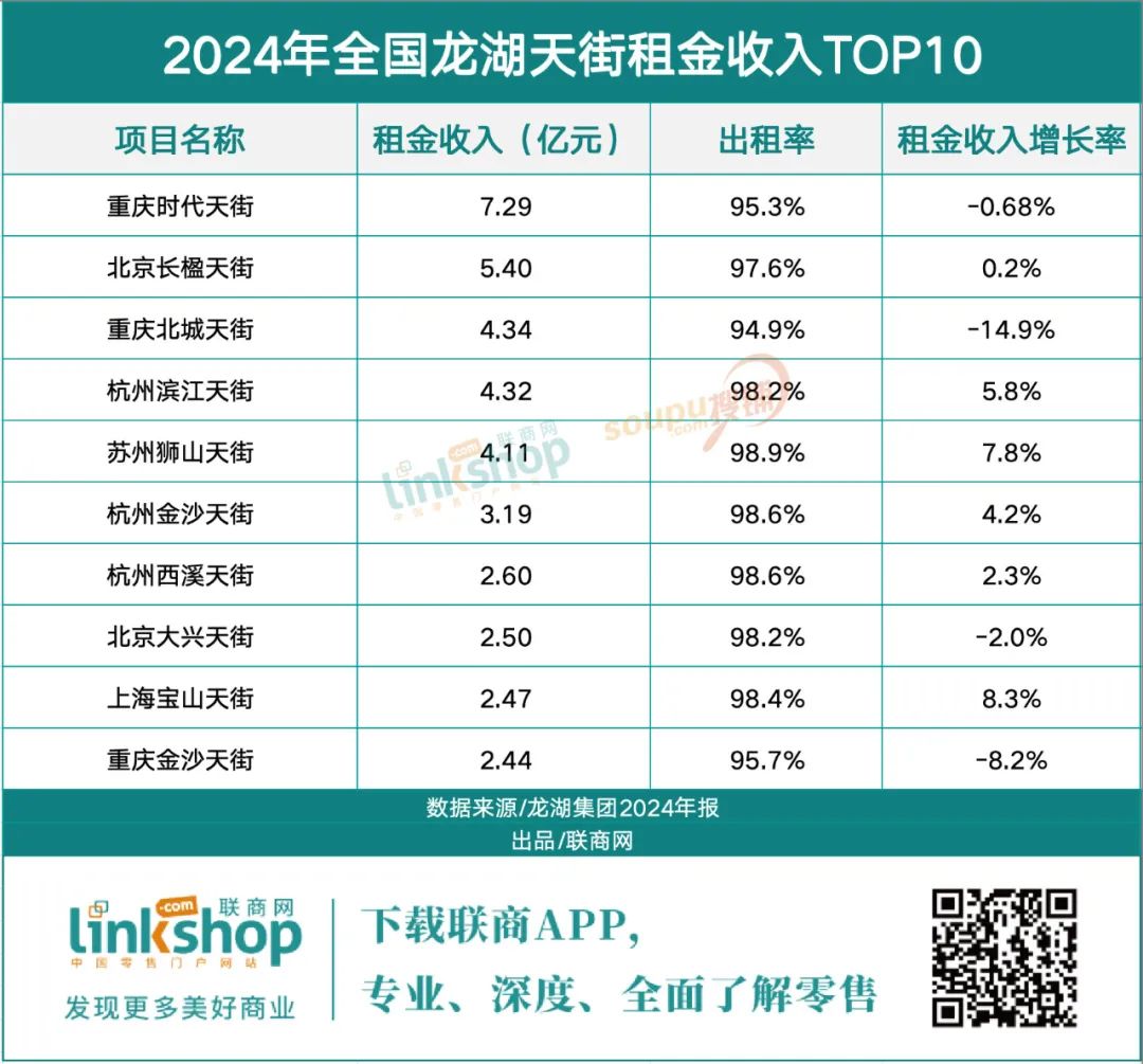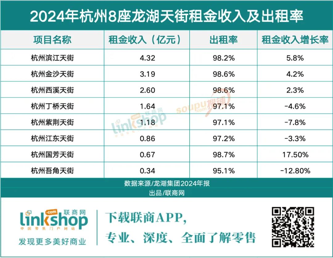 同時,根據(jù)龍湖集團的2024年度財報,龍湖天街體系內(nèi)的2024年商場租金收入前10中,杭州就獨占三席,濱江天街、金沙天街、西溪天街分列第4、第6、第7位。