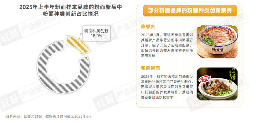 紅餐產(chǎn)業(yè)研究院分析發(fā)現(xiàn),2025年上半年,粉面樣本品牌的產(chǎn)品創(chuàng)新策略主要圍繞澆頭、湯底、粉面種類以及“粉面+”四個方面。