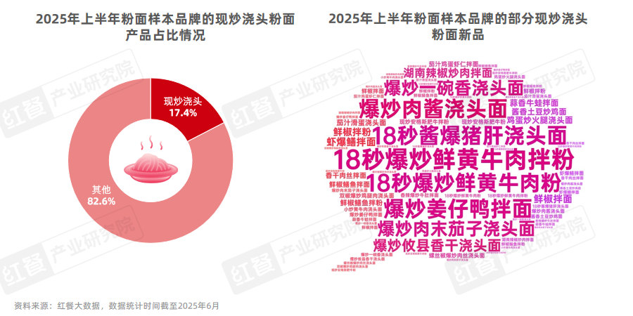 紅餐產(chǎn)業(yè)研究院統(tǒng)計,2025年1月至6月,樣本品牌共推出了29款現(xiàn)炒澆頭粉面產(chǎn)品,例如18秒爆炒鮮黃牛肉拌粉、爆炒姜仔鴨拌面、爆炒一碗香澆頭面等,占粉面新品總數(shù)的17.4%。