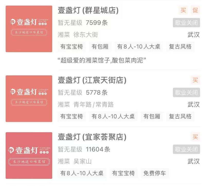 大眾點(diǎn)評(píng)數(shù)據(jù)則顯示,壹盞燈此前在武漢地區(qū)有6家門店,目前光谷店、夢(mèng)時(shí)代店、經(jīng)開永旺店仍在正常經(jīng)營,與品牌公眾號(hào)數(shù)據(jù)一致;而位于群星城、江宸天街及宜家聚會(huì)的3家門店目前為“歇業(yè)關(guān)閉”狀態(tài)。此外,壹盞燈位于深圳龍華壹方城的門店也顯示“歇業(yè)關(guān)閉”狀態(tài)。