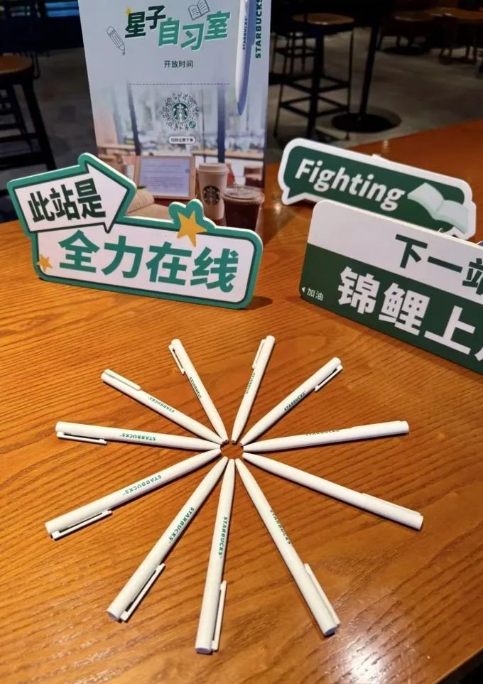 營(yíng)銷方面,打卡分享送圓珠筆和定制文具。為吸引粉絲傳播,星巴克推出特別活動(dòng):在任意消費(fèi)時(shí)段,將“星子自習(xí)室”相關(guān)內(nèi)容分享至朋友圈、小紅書(shū)或大眾點(diǎn)評(píng),即可獲得小禮品一份,包括星巴克圓珠筆及其他定制文具。