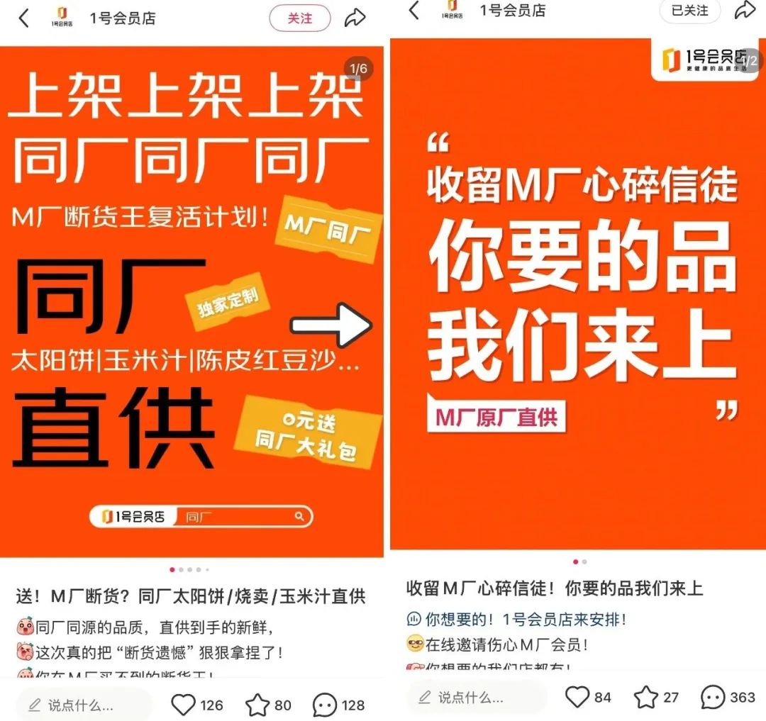 還有的會員店則直接打出了“收留M廠心碎信徒”的口號,京東旗下會員制超市一號會員店直接官方下場,推出了“M廠同廠直供”的計劃,有用戶在評論區(qū)直接在線許愿山姆下架產(chǎn)品,官方復(fù)刻同款。