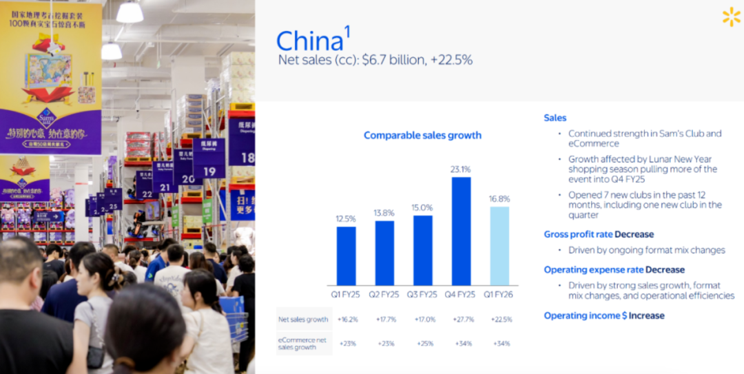 中國市場的優(yōu)異表現(xiàn),也正是撬動沃爾瑪增長的火車頭。沃爾瑪2026財年一季報顯示,截至2025年4月30日的單季內(nèi),沃爾瑪國際市場會員費收入增長22%,由山姆中國引領(lǐng)增長,若想持續(xù)提升會員費收入,就需要繼續(xù)擴張門店規(guī)模。