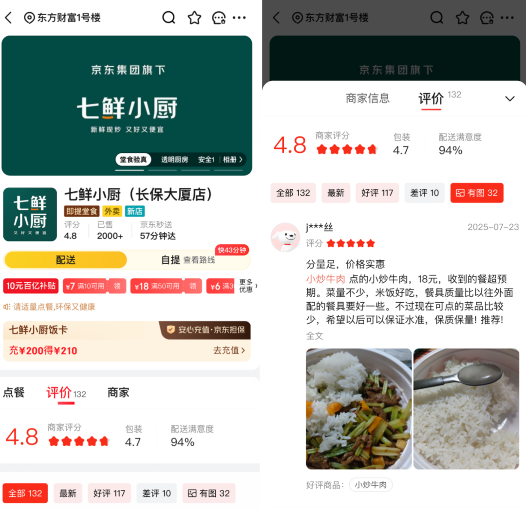 盡管存在這些問題,消費者對七鮮小廚的接受度依然可觀:截至7月24日16時,用戶評分為4.8分,配送滿意度為94%,好評率達89%,且集中在“分量足”“價格實惠”“性價比高”“透明廚房放心”等維度。