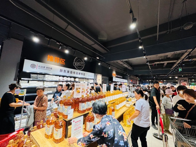在本地化布局上,桂發(fā)祥天津大麻花、海河系列牛奶等“津味”商品滿足本地口味。并集中陳列了DL果蔬餐具凈、D多功能潔面柔巾、DL飲用天然礦泉水、DL100%番茄復合果蔬汁、DL精釀小麥啤酒等幾十款胖東來自有品牌商品,與永輝優(yōu)選西梅干、燕麥脆、洗衣液等核心商品所在的自有品牌專區(qū),共同形成高品質(zhì)商品集合地。