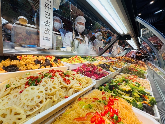 其中生鮮板塊實現(xiàn)跨越式升級!磅r”度管理成為最大亮點,寧夏硒砂瓜、麒麟瓜、哈密瓜等堆碼整齊,龍泉驛水蜜桃散發(fā)甜蜜香氣,吸引顧客駐足。果切區(qū)嚴格執(zhí)行“468鮮度管理”標準,即切好后超過4小時打8折、超過6小時打6折、8小時下架。蔬菜品類南方的“水八仙”鮮嫩上市,還有多種水培、有機、定向種植蔬菜,實現(xiàn)了從田間到貨架全程可溯源,消費者只需輕掃包裝溯源碼,即可查看土壤檢測、采收加工等全鏈信息,讓顧客吃得安心、明白。肉禽蛋品類新增了亞麻籽豬肉、現(xiàn)切潮汕牛肉、進口原切牛排及可生食雞蛋,滿足多元化需求。