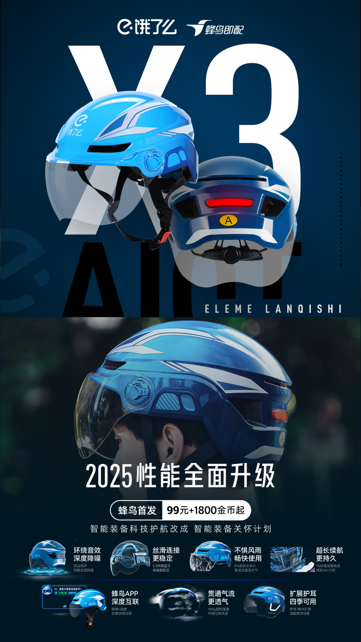 安全提升方面,餓了么智能頭盔X3也尤為亮眼。