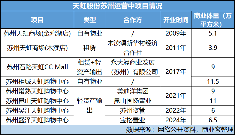 截至2024年末,天虹股份在全國(guó)7省/市的35個(gè)城市,共經(jīng)營(yíng)購(gòu)物中心45個(gè)(含加盟5個(gè)),經(jīng)營(yíng)面積278.54萬平方米。其中蘇州布局6個(gè),占整個(gè)華東區(qū)域9個(gè)項(xiàng)目的近7成。