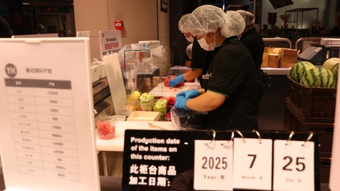 在商品層面,生鮮區(qū)域作為重點(diǎn),顯著強(qiáng)化了“鮮”度管理。龐各莊西瓜、寧夏硒砂瓜堆碼整齊,平谷大桃與龍泉驛水蜜桃香氣四溢,吸引顧客駐足。果切產(chǎn)品嚴(yán)格執(zhí)行“468鮮度管理”原則,切好后超過4小時(shí)八折、6小時(shí)六折、8小時(shí)下架,確保最佳食用體驗(yàn)。烘焙區(qū)毛毛蟲面包、核桃滿滿乳酪面包、“豐收的喜悅”歐包等新鮮出爐,更有黃油曲奇餅干、榴蓮大福、豐收的喜悅之菌菇多多等全新亮相。