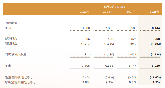 根據(jù)財(cái)報(bào),2022-2025財(cái)年內(nèi),滔博門店數(shù)量從最高的8006家銳減近3000家至5020家,幾乎消失了一個(gè)寶勝;門店毛銷售面積同比下降幅度擴(kuò)大至兩位數(shù);單店銷售面積同比波動(dòng)下滑。