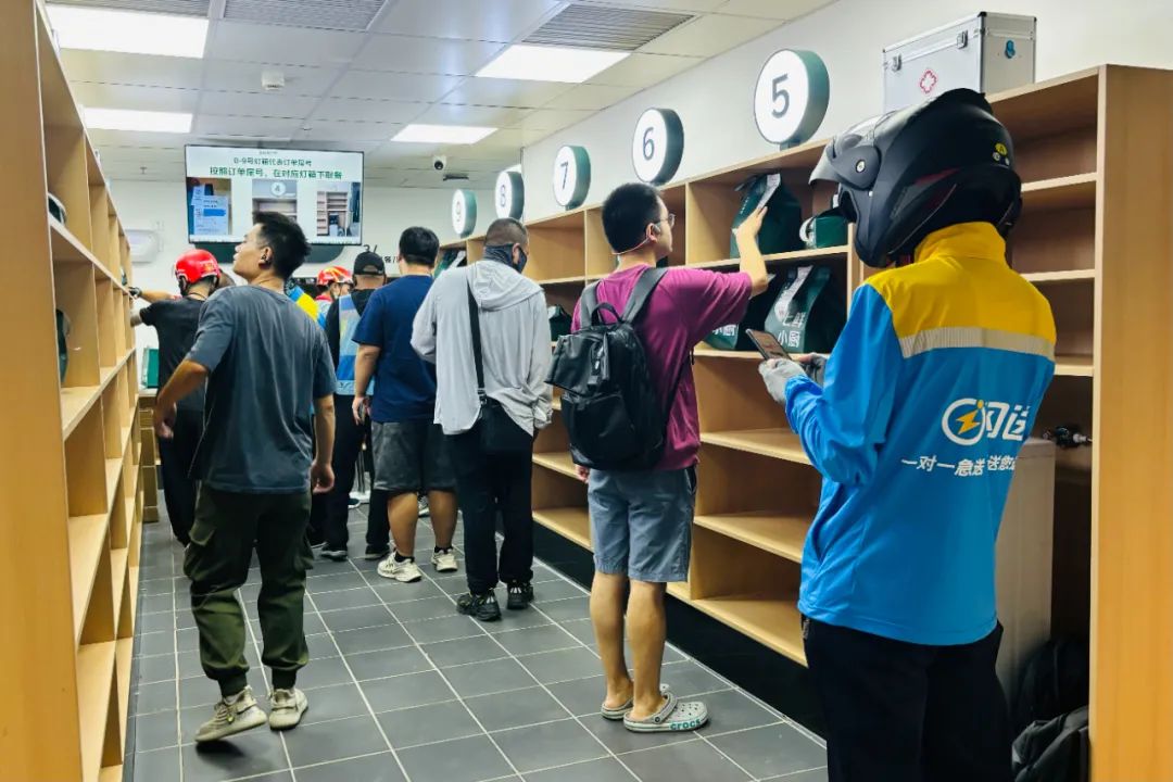 取餐區(qū)約十幾平米,設(shè)有兩個(gè)出入口:一側(cè)為外賣員取餐區(qū),另一側(cè)為自提區(qū)。取餐架上配有0至9號(hào)燈箱,騎手或顧客可根據(jù)訂單尾號(hào)在對(duì)應(yīng)燈箱處取餐,以提升效率。