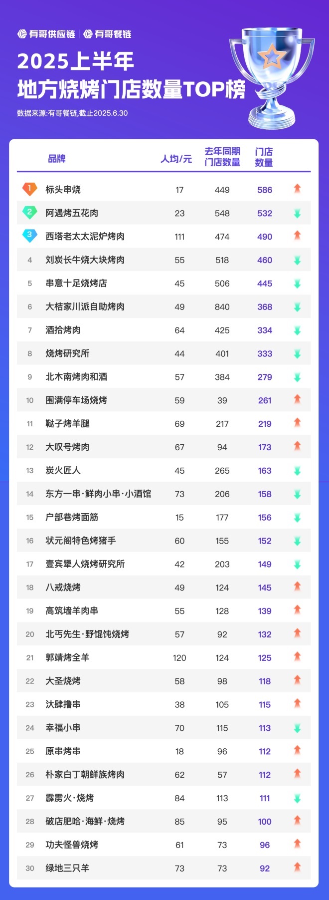 更像一場“南北對攻戰(zhàn)”:標(biāo)頭串燒(586家)、阿遇烤五花肉(532家)繼續(xù)領(lǐng)跑,但南方品牌正在快速補課。
