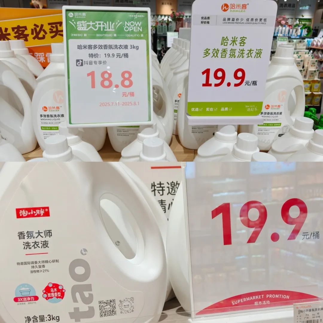 再以洗衣液為例,哈米客自營的多效香氛洗衣液3kg一桶售價19.9元(抖音限時團(tuán)購價18.8元一桶),對比淘小胖的自營香氛洗衣液售價19.9元,但淘小胖在洗衣液外包裝上特明注明:活性物大于等于21%。