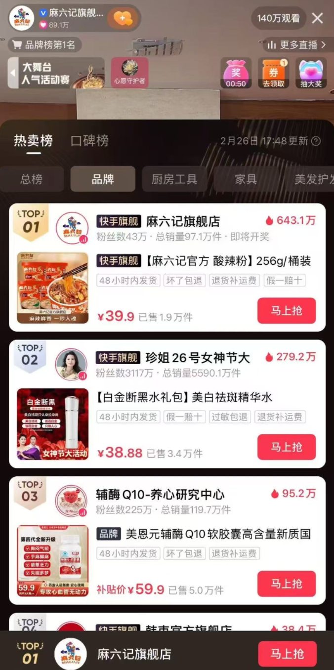直播間的觀看量也超過了60萬,最終登上快手品牌榜第二名。