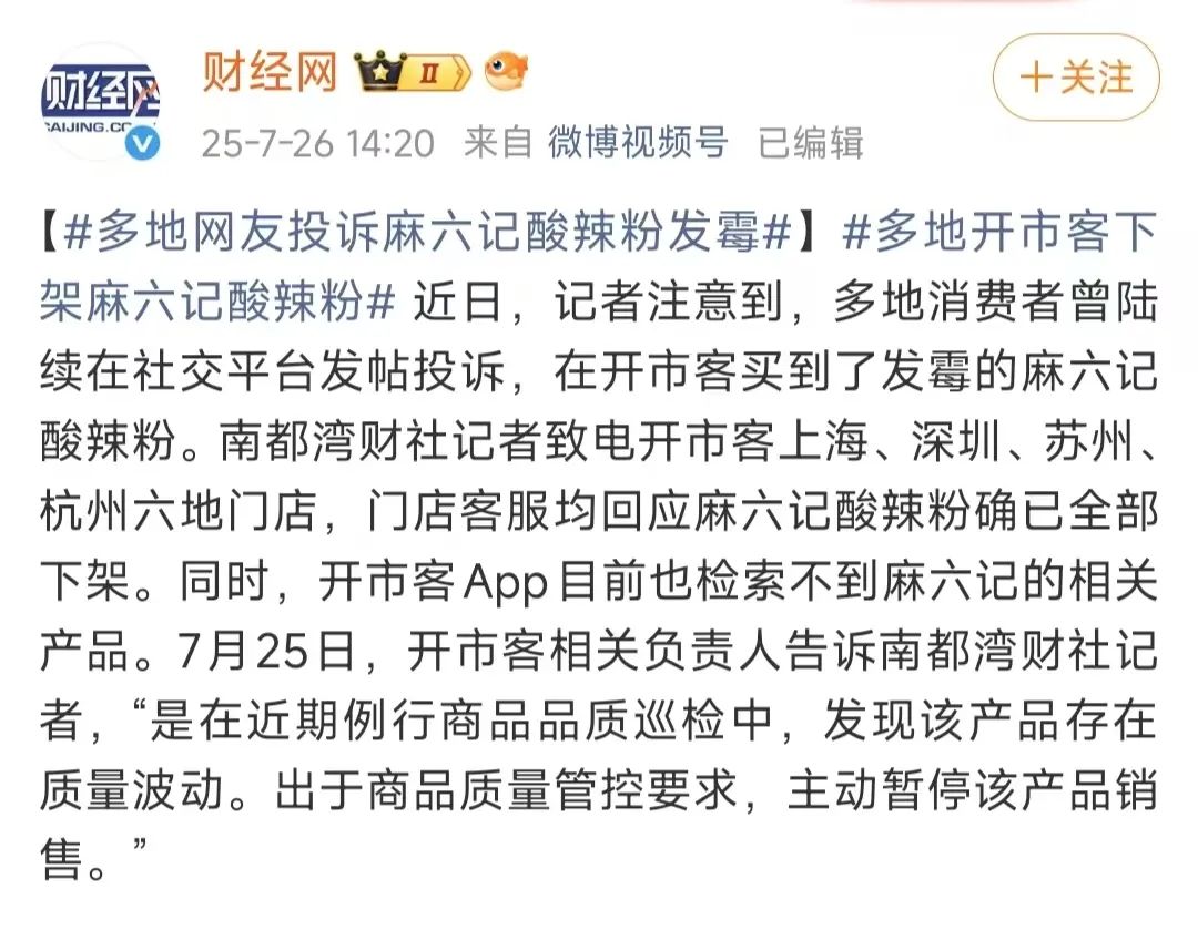 麻六記酸辣粉被曝發(fā)霉沖上熱搜,產(chǎn)品全部下架