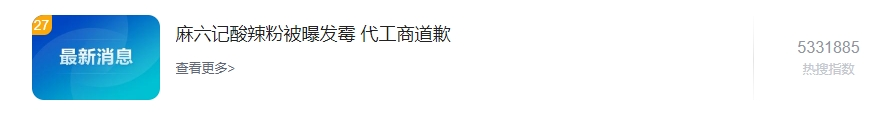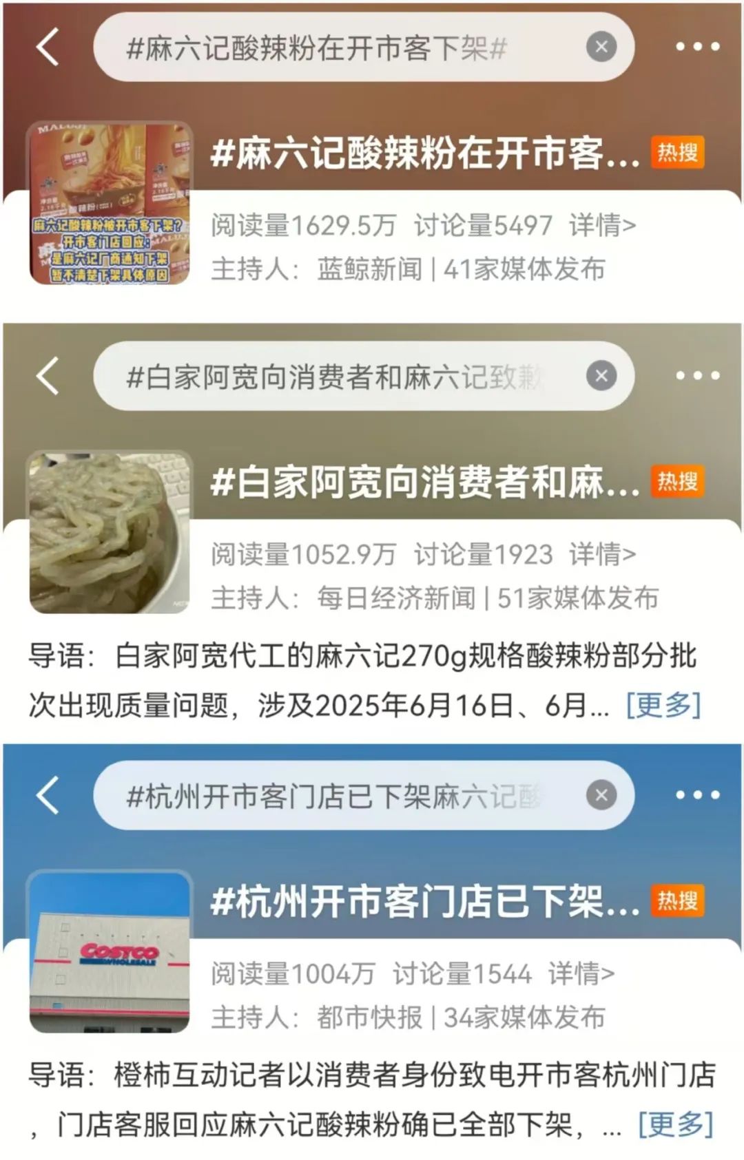 相關(guān)輿論在持續(xù)不斷地發(fā)酵,#麻六記酸辣粉被曝發(fā)霉 代工商道歉#、#麻六記酸辣粉在開市客下架#、#白家阿寬向消費者和麻六記致歉#等話題,也紛紛沖上各平臺熱搜。