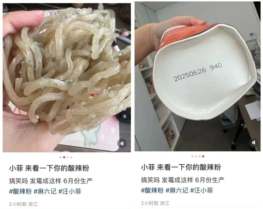 萬萬沒想到,時隔一年,麻六記的產(chǎn)品就被曝出發(fā)霉,攤上事的正好就是汪小菲兒子試吃過的酸辣粉。