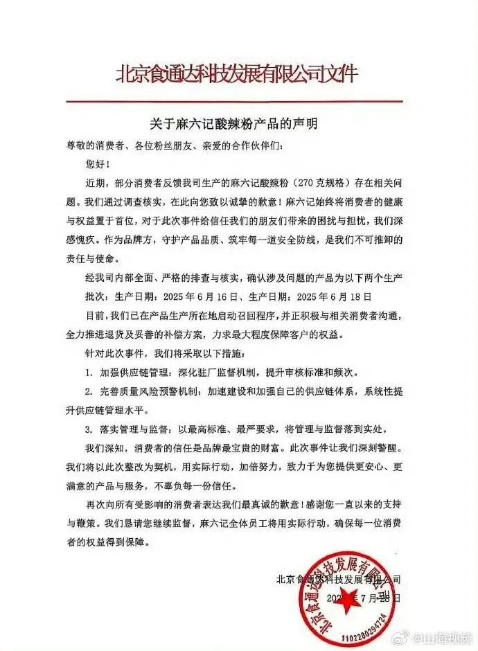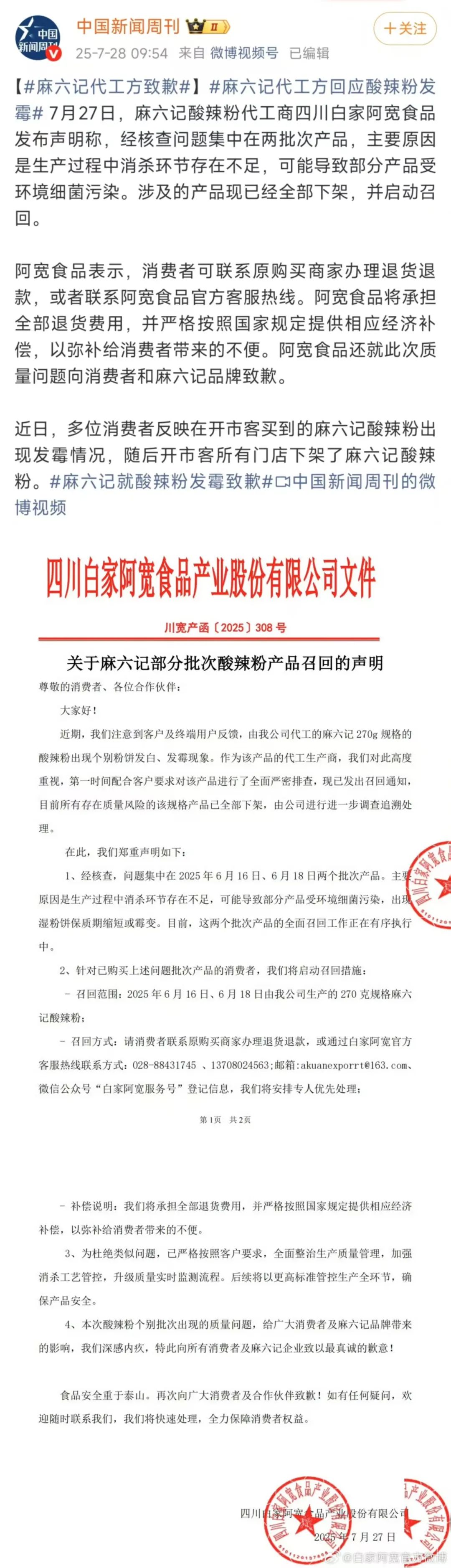 麻六記酸辣粉的代工商“白家阿寬”對此發(fā)布聲明,承認(rèn)生產(chǎn)過程中消殺環(huán)節(jié)不足,導(dǎo)致濕粉餅受細(xì)菌污染霉變,已啟動召回問題批次產(chǎn)品方案(集中于2025年6月16日和6月18日生產(chǎn))。