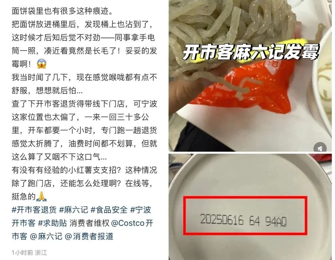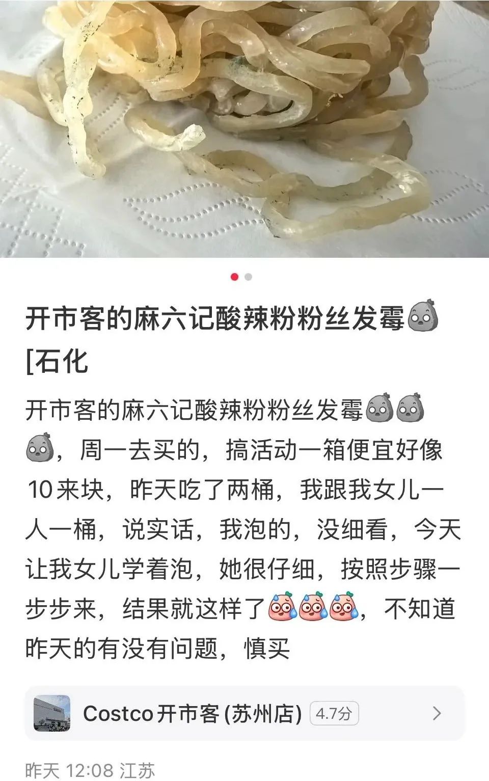 近日,不少網(wǎng)友在社交平臺發(fā)文稱,自己在開市客購買的麻六記酸辣粉,面餅竟然長毛發(fā)霉了,肉眼就可以看見綠色或白色霉斑,甚至還散發(fā)著刺鼻異味。