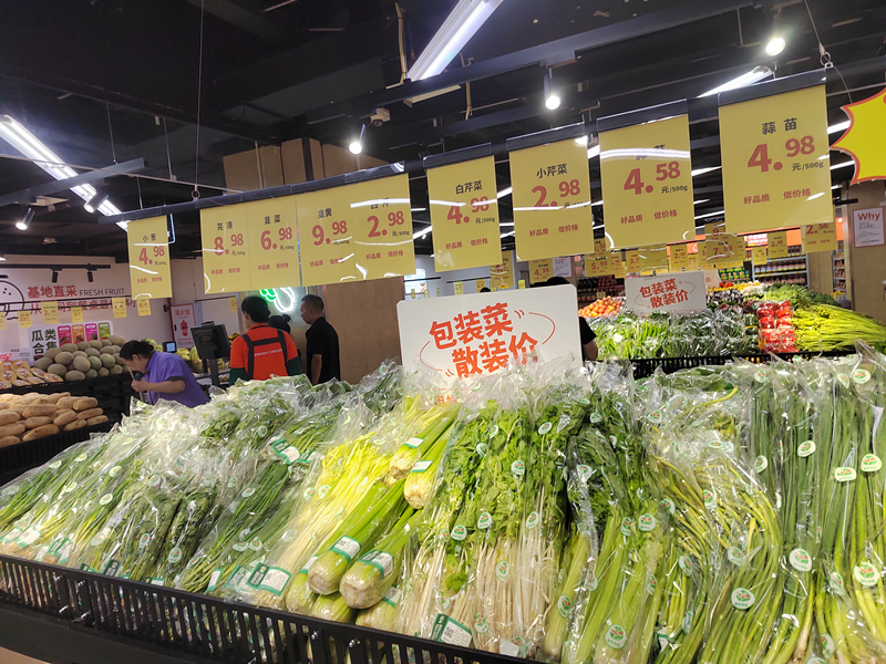 除通過供應(yīng)鏈壓縮成本外,在新世紀(jì)超級市集渝北店,筆者看到蔬菜、干貨等生鮮商品都做成了包裝標(biāo)品,在陳列區(qū)域內(nèi)還有“包裝品,散裝價”的宣傳。正在挑選蔬菜附近小區(qū)的王女士表示,“這種包裝的還方便些,拿起就走,還干凈,價格跟散裝都差不多。”項目負(fù)責(zé)人說:你看,這不僅解決顧客“挑揀費時、稱重排隊”的痛點,也大幅降低了我們門店運營損耗提升了人效。