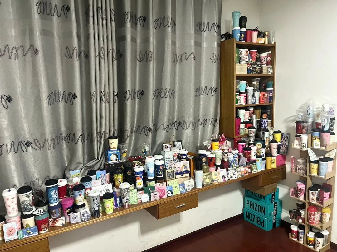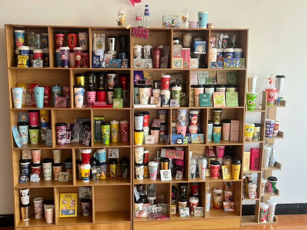杜昕家里三樓客廳的木質(zhì)柜子早已塞滿,放不下的周邊便挪進(jìn)房間繼續(xù)陳列。杜昕告訴驚蟄研究所,自2022年起,他收集的奶茶杯、咖啡杯大大小小約有200多個(gè)(不包含重復(fù)款式),覆蓋瑞幸、霸王茶姬、奈雪的茶、茶百道等11個(gè)國(guó)內(nèi)茶飲品牌,以及少量小眾或本地品牌!耙婚_始為了聯(lián)名杯子瘋狂喝,后來(lái)慢慢就少了,但是有喜歡的還是會(huì)去買”。除了杯子之外,紙袋、貼紙、冰箱貼、徽章、香薰等周邊他也都有在零散收集。