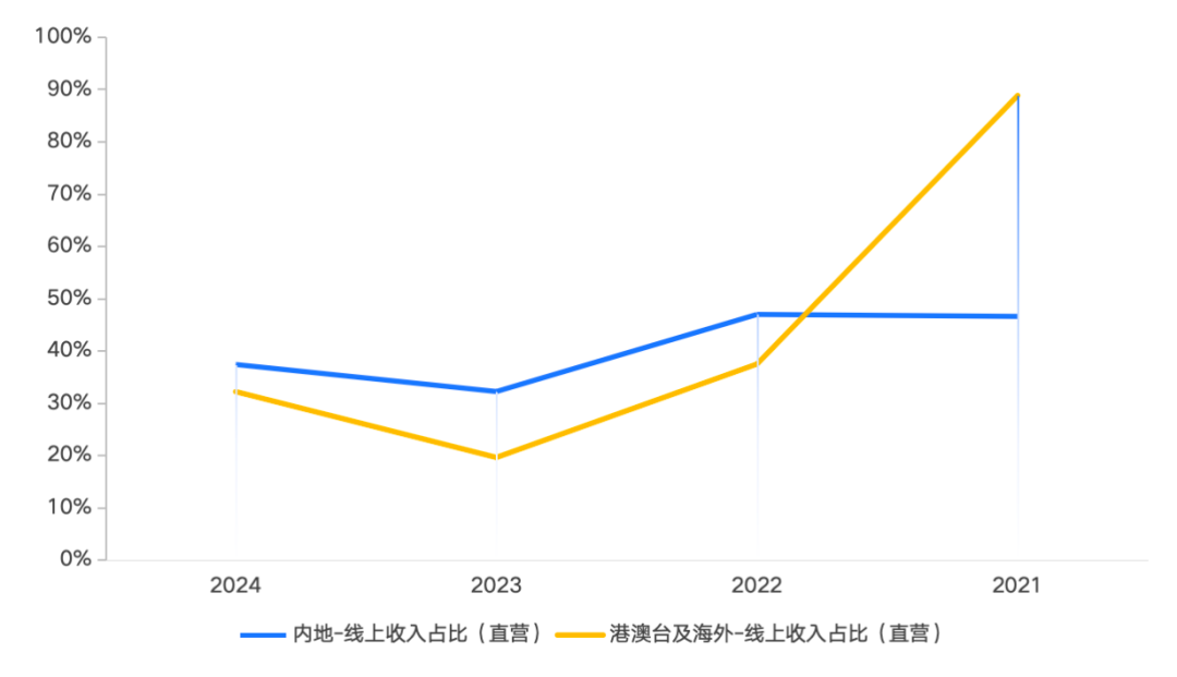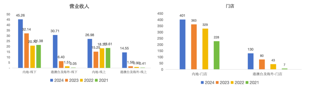 (1)港澳臺及海外營收增速遠高于內(nèi)地,收入占比不斷逼近內(nèi)地,2025年大概率實現(xiàn)反超。2021-2024年,內(nèi)地線下直營收入從21.38億元增長至45.26億,復(fù)合增速28%;港澳臺及海外線下直營收入從0.05億增長至30.71億元,復(fù)合增速750%。王寧在人民日報的采訪中也指出“2025年,海外銷售大概率會超過國內(nèi)”。