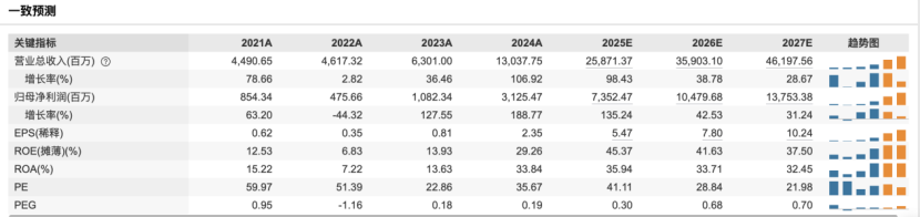 根據(jù)Wind一致預(yù)測數(shù)據(jù)(近180天),泡泡瑪特2025、2026、2027年的歸母凈利潤分別為73.52、104.8、137.53億元,同比增速為135.24%、42.53%、31.24%,對應(yīng)2027年的前瞻市盈率約為22倍。