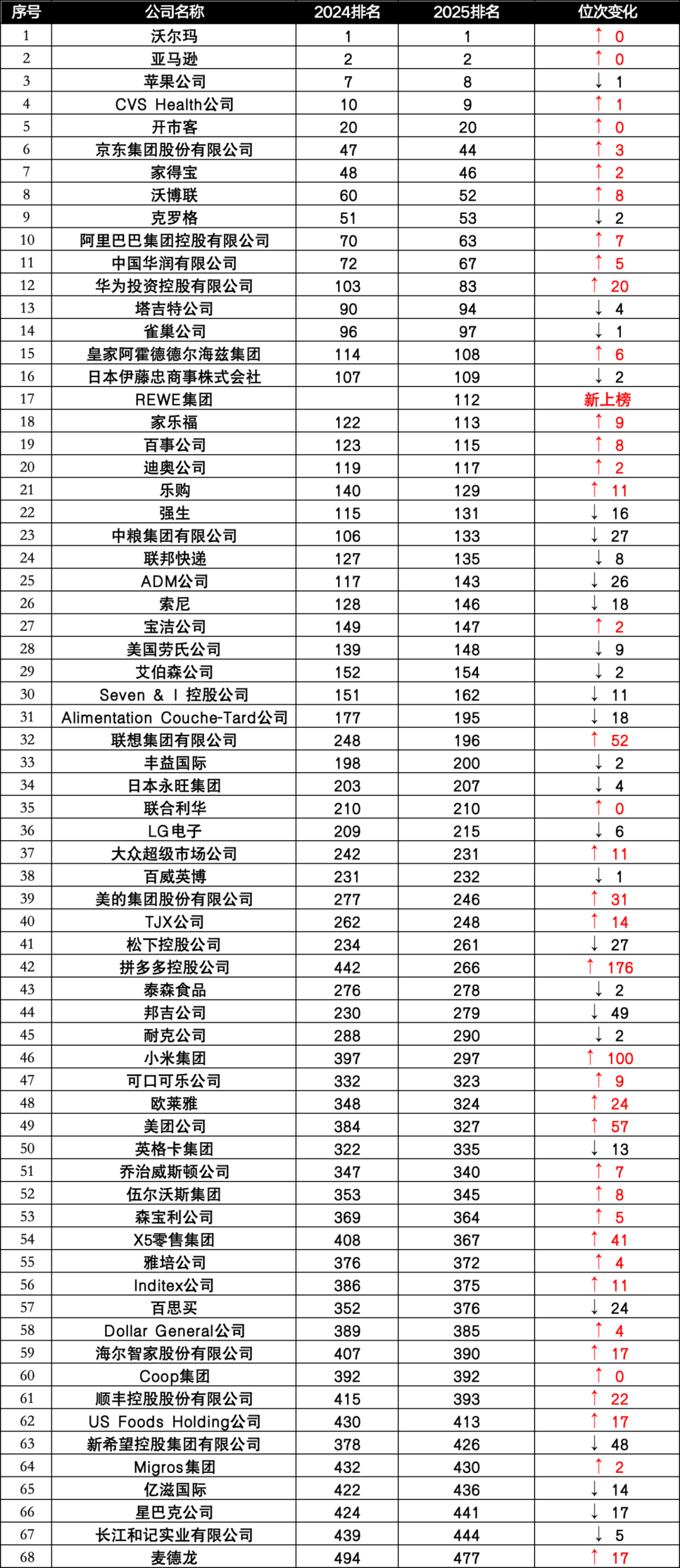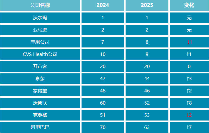 前10名中有7家美國企業(yè),中美包攬全部席位。最顯著的特點是頭部格局極其穩(wěn)定——沃爾瑪和亞馬遜連續(xù)兩年霸占前二,開市客穩(wěn)守第20名。中段排名則競爭激烈,京東集團小幅上升3位至44名,美國家居建材零售專家家得寶上升2位至46名。電商平臺阿里巴巴也延續(xù)了上升勢頭,進步7位。值得注意的是克羅格作為唯一入榜的傳統(tǒng)超市,排名微降2位,而消費電子標桿蘋果公司也出現(xiàn)了1位的罕見下滑。