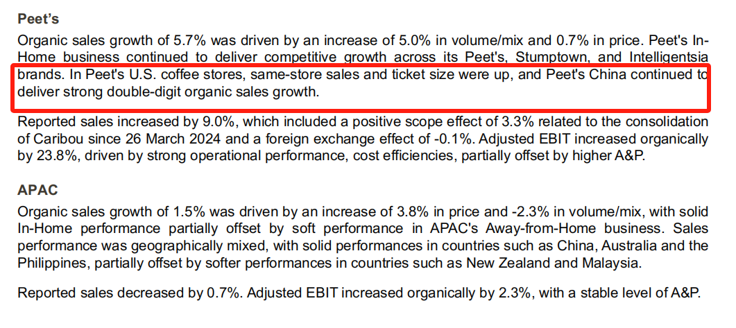 從皮爺咖啡的母公司JDE Peet's發(fā)布的2024年財(cái)報(bào)來看,整體來看,皮爺咖啡是有一定受眾的,且目前在中國市場(chǎng)的表現(xiàn)還不錯(cuò)。