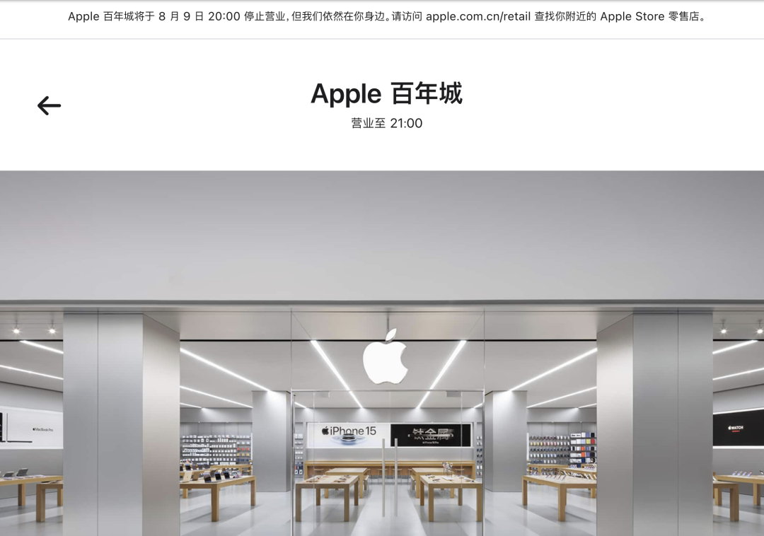 7月29日消息,蘋果官網(wǎng)顯示,Apple Store大連百年城店將于今年8月9日20:00停止?fàn)I業(yè)。