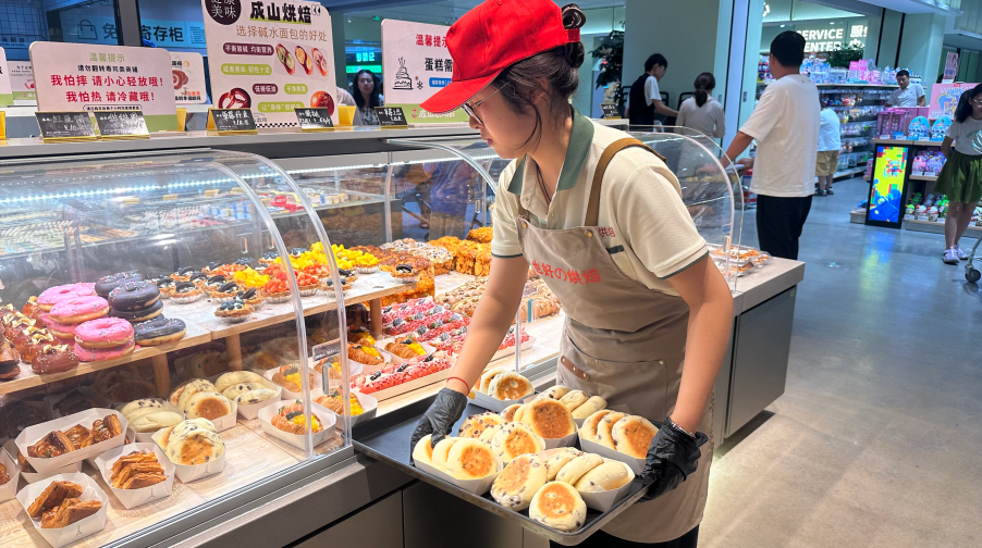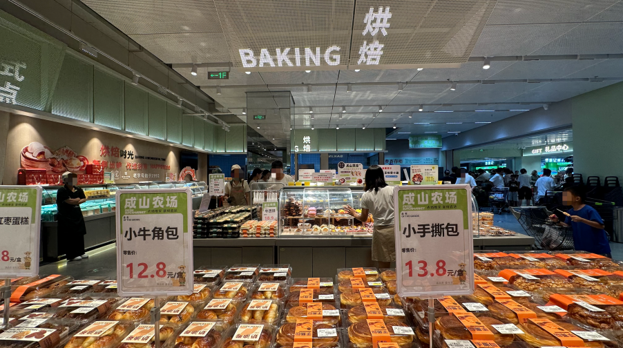 我們認為現(xiàn)場感很重要:烤腸現(xiàn)烤、面包現(xiàn)烘,顧客能看到制作過程,買完菜順手帶份熟食,這比單純賣菜粘性強太多。