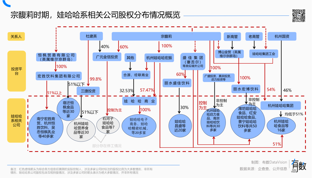 考慮到當(dāng)時娃哈哈與達(dá)能的合作,雖然控制人是仍在留學(xué)期的宗馥莉,但實際控制人大概率依然是宗慶后[1]。