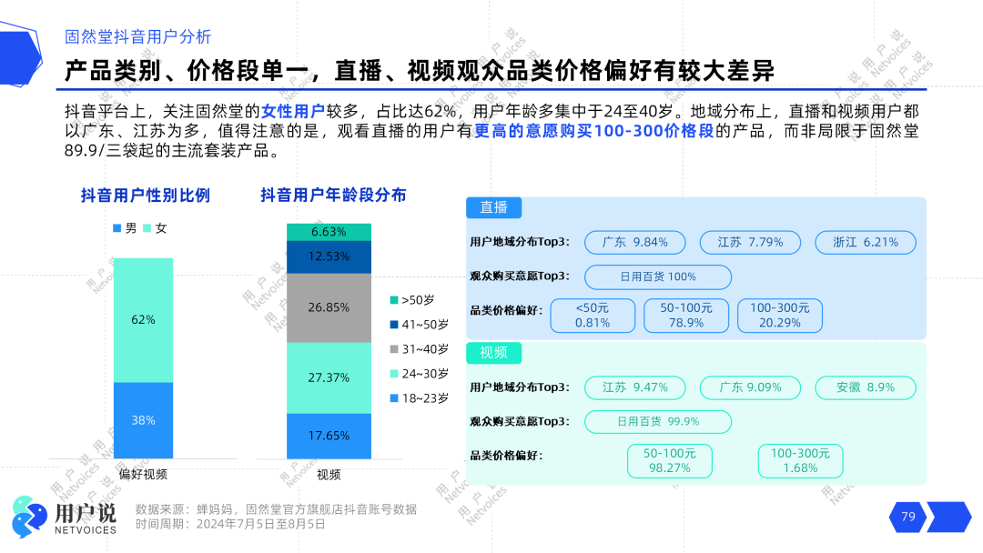 以頭發(fā)護(hù)理品牌固然堂為例,據(jù)用戶說(shuō)調(diào)研統(tǒng)計(jì),在抖音平臺(tái)上,關(guān)注固然堂的女性用戶較多,占比達(dá)62%,用戶年齡多集中于24至40歲。據(jù)巨量算數(shù)顯示,固然堂的品牌代言人李若彤在抖音上的觀眾中,31歲-40歲年齡段占比最高,且女性占比51%,完美契合了固然堂的受眾定位。
