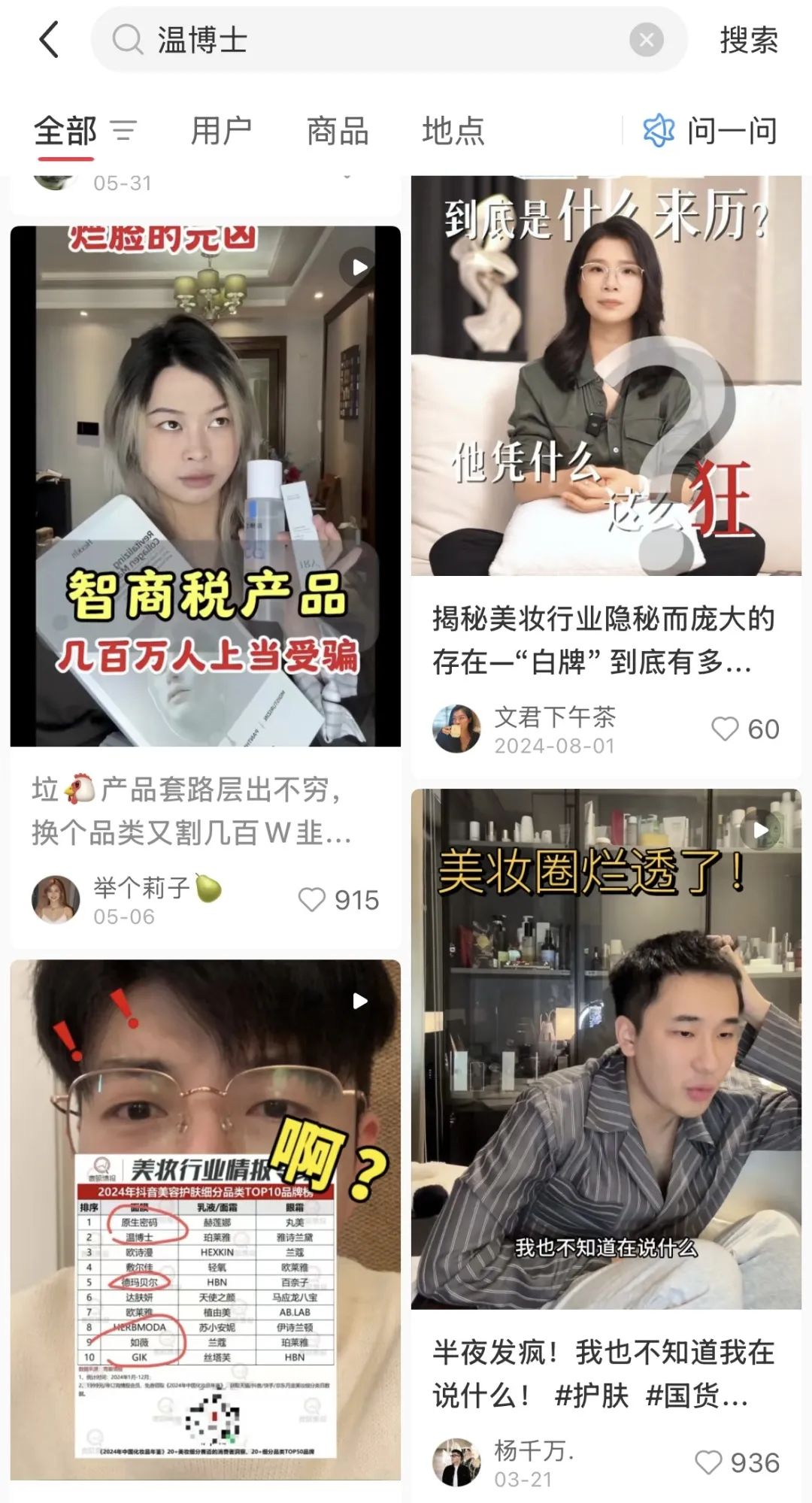 溫博士也曾陷入輿論漩渦,原因?yàn)槠湫麄鞯摹?%的水楊酸與5%的維生素原B5添加”被曝光實(shí)際添加量遠(yuǎn)低于宣稱值(據(jù)曝光不足0.01%),遭到了大量消費(fèi)者的抵制,以至于在2024年5月被列入快手電商限售清單,抖音百萬(wàn)粉絲賬號(hào)口碑逆跌。至今在小紅書(shū)平臺(tái)上搜索溫博士,依舊能發(fā)現(xiàn)用戶發(fā)布的“避雷帖”,內(nèi)容涉及“成分表”“智商稅”,直指品牌產(chǎn)品質(zhì)量問(wèn)題。