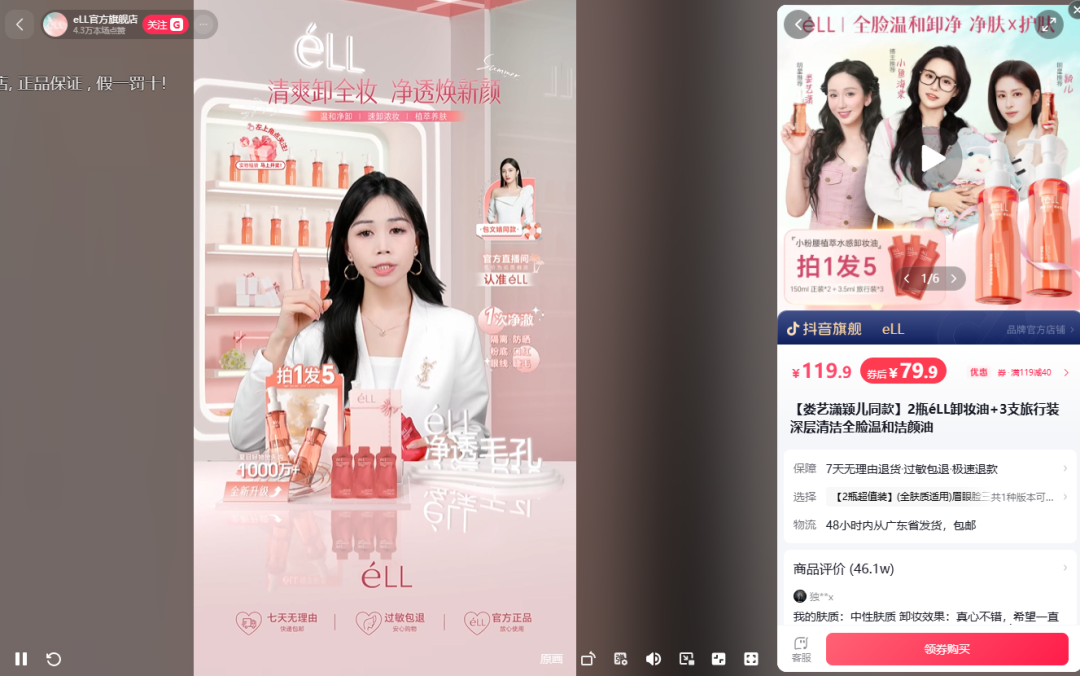 點(diǎn)開(kāi)éLL的抖音直播間,能清晰地在右上角看到各種明星、網(wǎng)紅的照片輪播:包文婧、何泓姍、小魚(yú)海棠......點(diǎn)開(kāi)商品鏈接,則能看到商品名稱處標(biāo)注了明顯的“婁藝瀟同款”“穎兒同款”標(biāo)簽。護(hù)膚品牌造物者的直播間也大同小異:屏幕的三分之一被“陳紫函推薦”海報(bào)占據(jù),商品詳情著重標(biāo)注“陳紫函同款”詞語(yǔ)。