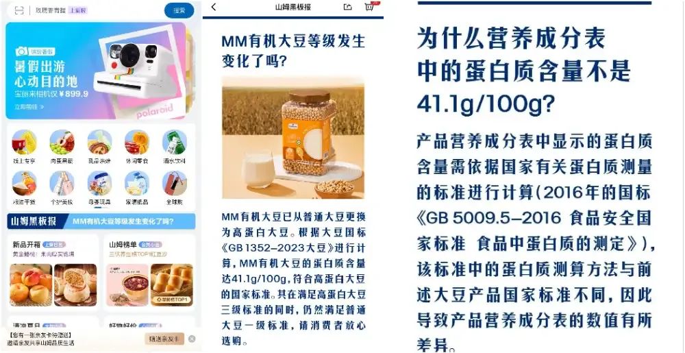 以有機(jī)大豆風(fēng)波為例,山姆出面回應(yīng)網(wǎng)友們核心質(zhì)疑點(diǎn):一是原料從普通大豆更換成了高蛋白大豆,在滿足高蛋白大豆三級(jí)標(biāo)準(zhǔn)的同時(shí),仍然滿足普通大豆一級(jí)標(biāo)準(zhǔn);二是針對(duì)營(yíng)養(yǎng)成分表中蛋白質(zhì)含量不是41.1g/100g,原因是兩款商品的測(cè)算標(biāo)準(zhǔn)不同。