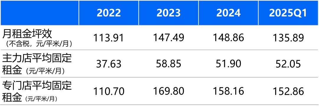 可以看出項目無論是整體租金坪效,還是專門店的平均固定租金,在2024-2025年的一季度,都呈現(xiàn)出下行趨勢。原因應當是新簽租約的租金價格較低,拉低了整體平均值所致。