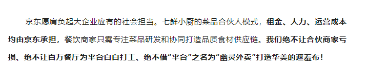 這一聲明耐人尋味,不禁讓人聯(lián)想到不久前才開(kāi)店的京東七鮮小廚。七鮮小廚的模式就是自營(yíng)外賣(mài),京東自己親自下場(chǎng)參與餐飲市場(chǎng)。