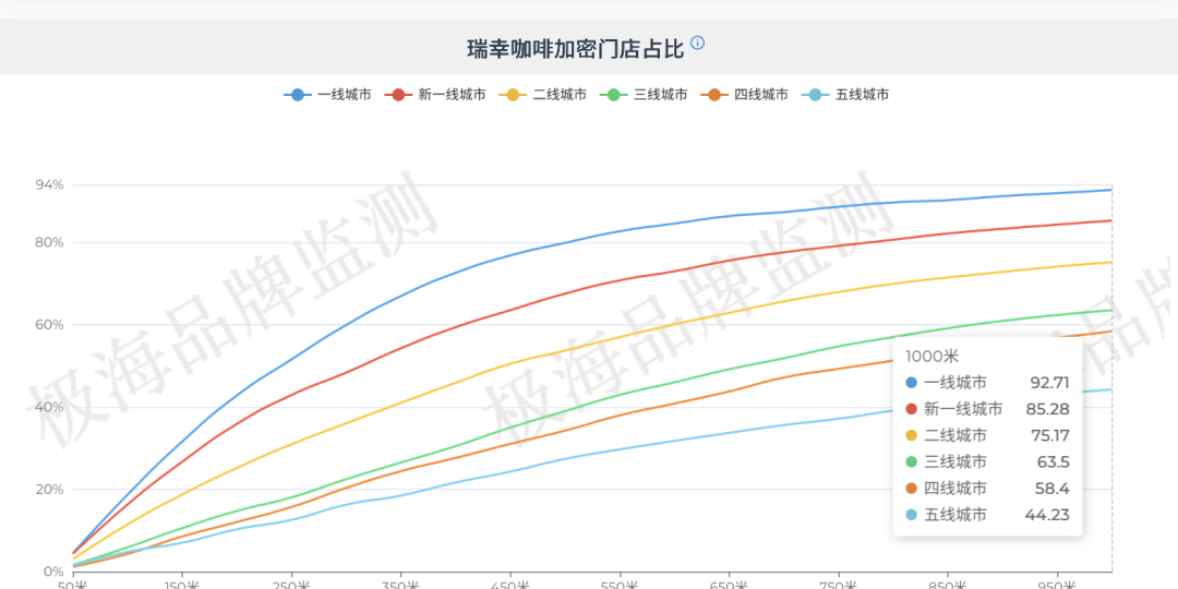 源Sight根據(jù)極海品牌監(jiān)測的最新數(shù)據(jù)發(fā)現(xiàn),截至2025年7月30日,在一線城市,瑞幸1000米以內(nèi)至少有2家門店的比例為92.71%,新一線、二線、三線、四線和五線城市分別為85.28%、75.17%、63.5%、58.4%和44.23%。