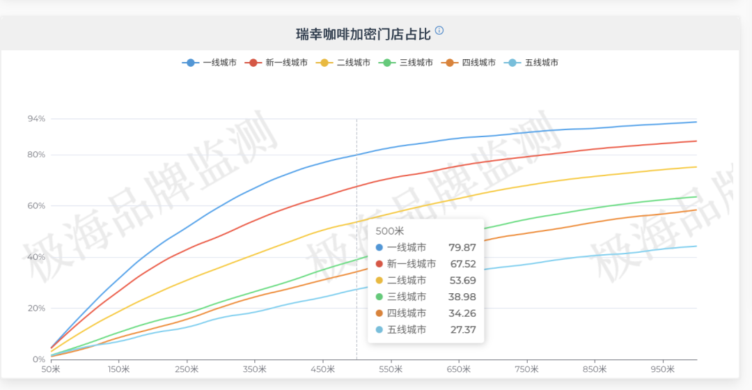 而在一線城市,瑞幸500米以內(nèi),至少有2家門店的比例為79.87%,新一線、二線、三線、四線和五線城市分別為67.52%、53.69%、38.98%、34.26%和27.37%。