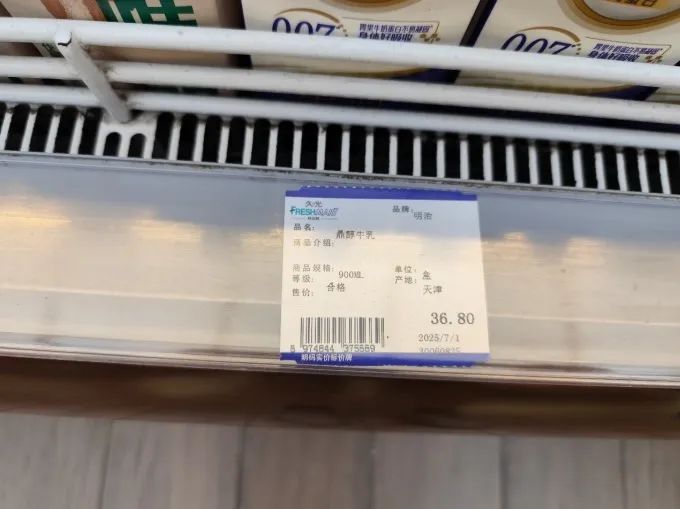 筆者考察這個(gè)生鮮超市的日期是7.13,鮮牛奶顯示的生產(chǎn)日期是7.8,而價(jià)格簽顯示是36.8元/900毫升/盒。