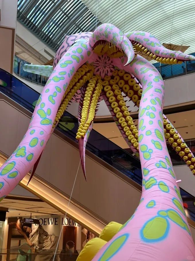 某購物中心中庭和店鋪。上面一張是商場中庭的一次推廣活動的裝飾,八爪魚,裝飾高5米,色彩鮮艷,中庭設(shè)置座椅和互動屏幕;下面一張是周邊店鋪分布,茶飲店與零售品牌相鄰。
