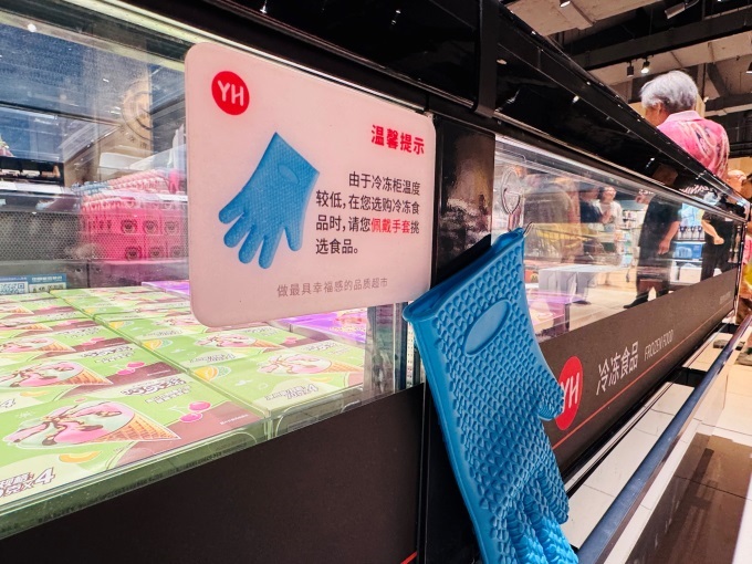 在商品接觸細(xì)節(jié)上,為毛巾、襪子等衛(wèi)生家居用品配備粉色隔離袋,避免與生鮮熟食直接接觸;在調(diào)味品等貨架旁放置放大鏡,方便顧客查閱商品信息;連卷袋旁設(shè)置濕手器,便于顧客取用;散裝食品標(biāo)注一斤約幾個(gè),購(gòu)買數(shù)量更加明確;果切組合則按照水果糖度高低標(biāo)明最佳食用順序。