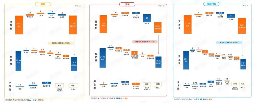 從商家端看,美團(tuán)商家實(shí)際收入最高,京東次之,淘寶閃購(gòu)最低。值得注意的是,京東平臺(tái)商家收入甚至高于消費(fèi)者支付價(jià),凸顯京東對(duì)商家的強(qiáng)力補(bǔ)貼。