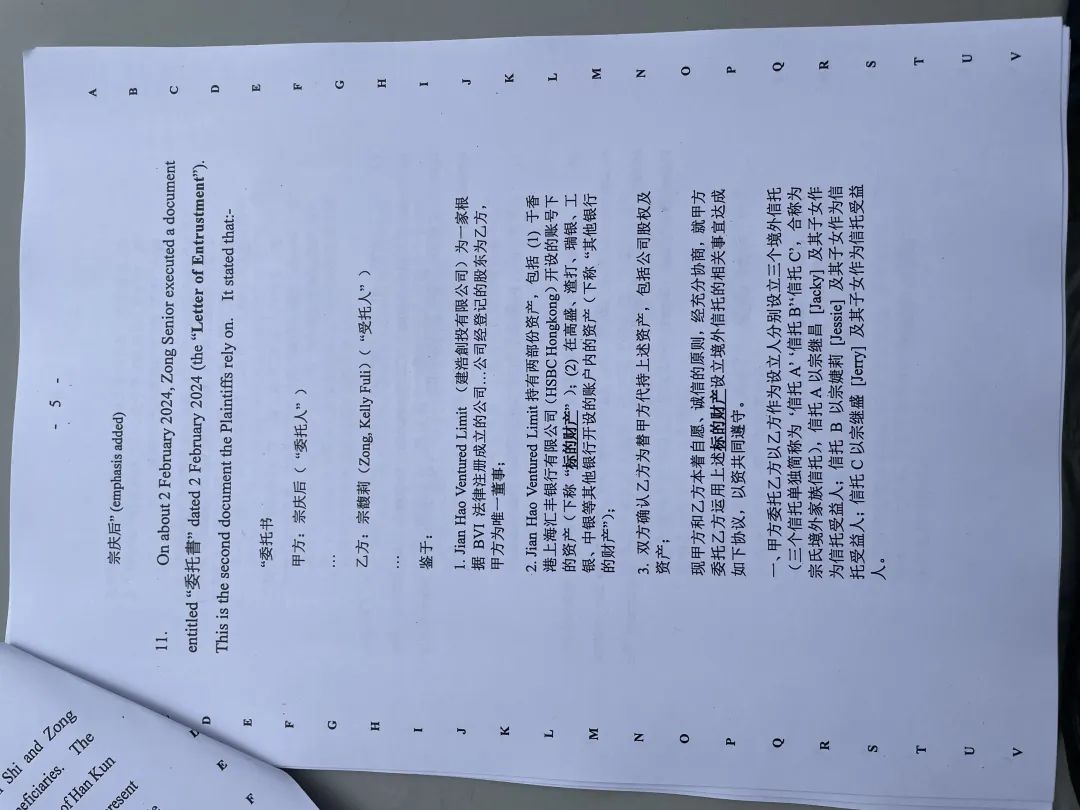 根據(jù)裁決書,原告的案件主要依據(jù)三份文件,包括宗慶后的手寫指示、委托書及宗馥莉簽署的中文確認函、各方就宗慶后去世引發(fā)的事宜訂立的一份名為《協(xié)議》的文件。
